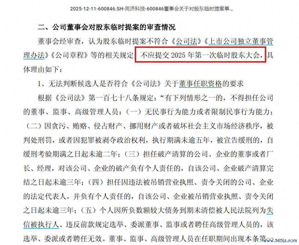2025年12月8日,量鼎实业向同济科技董事会提交临时提案,提议选举徐权、章海峰等9名候选东说念主(含2名现任董事)组成新一届董事会及监事会,并在提案中强调,上市公司董事会、监事会“超期入伍”已近半年,“不利于公司治理”。